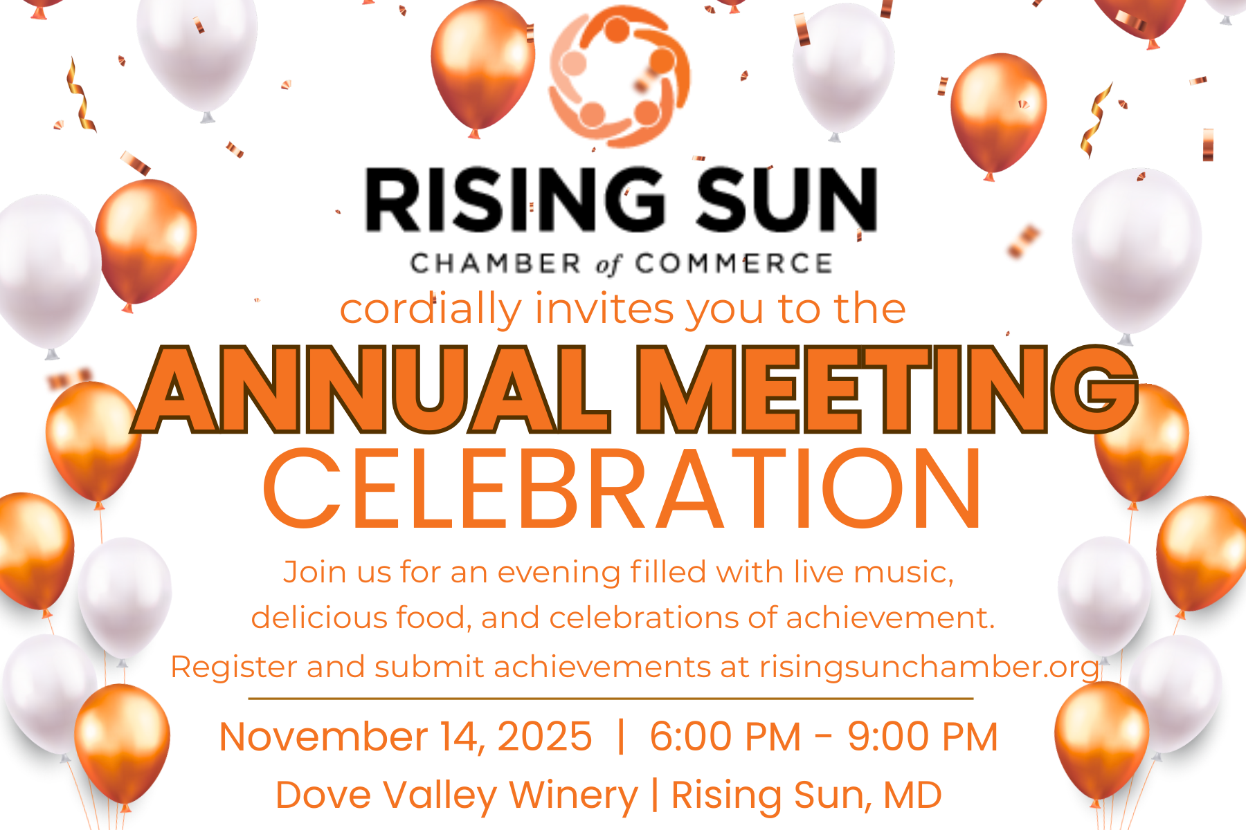 Join us at Dove Valley Winery for The Rising Sun Chamber of Commerce Annual Meeting. Come help us celebrate the accomplishments of the members of The Rising Sun Chamber of Commerce!