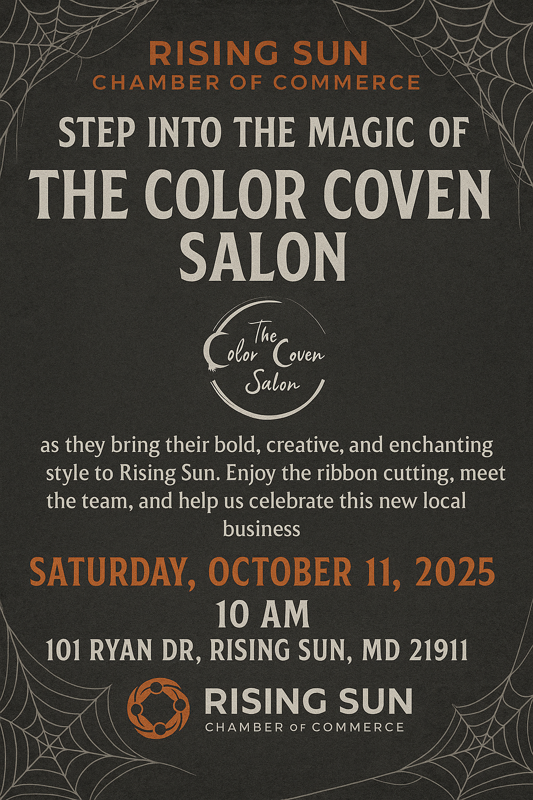 The Color Coven Salon Join us for a ribbon cutting at The Color Coven Salon. CLICK HERE to RSVP. + Add to Google Calendar + iCal / Outlook export Date Oct 11 2025 Expired! Time 10:00 am - 5:00 pm Location The Color Coven Salon 101 Ryan Dr. Rising Sun, MD 21911 Category Local Events Member Events Networking Share this event