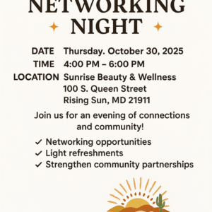 Networking Night at Sunrise Beauty & Wellness 30 Oct 4:00 pm - 6:00 pm Sunrise Beauty & Wellness100 S. Queen St. Rising Sun, MD 21911